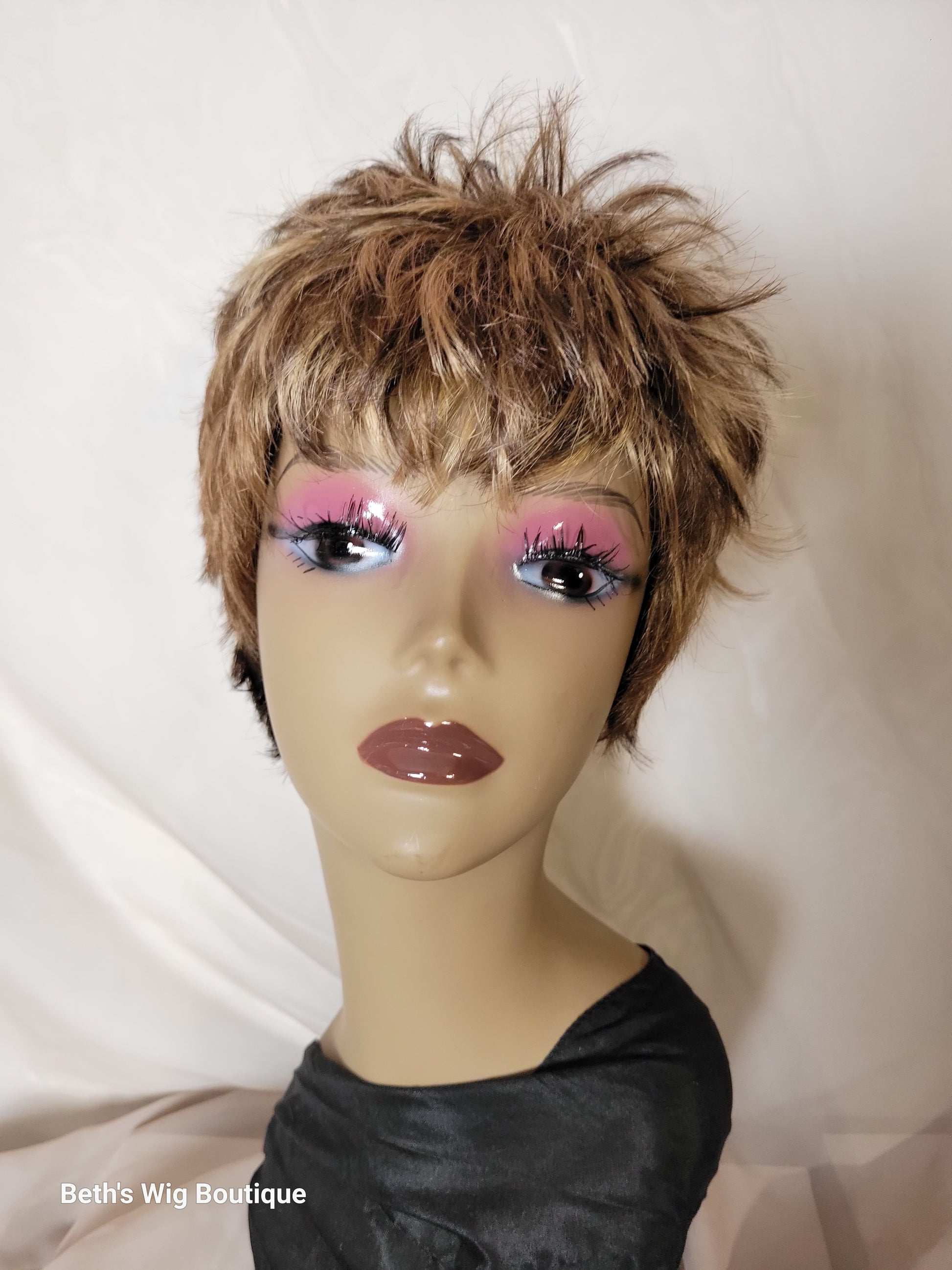 VIKKI by Paula Young in Butter Pecan T8/12/14: Short, texturized pixie wig with razor-cut layers and piecey bangs. Texturized, razor-cut layers throughout give a choppy, fashion edge to this short pixie wig. Piecey bangs accentuate the eyes for a flattering finish. Kanekalon® WhisperLite® synthetic fibers.