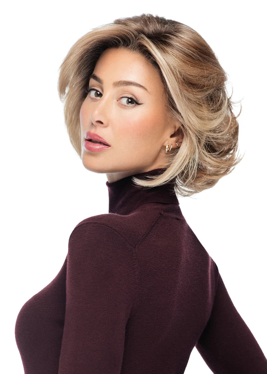 A softly layered, tousled mid-length bob with multidimensional waves and natural volume. Designed to brush behind the ears or frame the face, with a hand-knotted monofilament top and lace front for seamless blending and parting. Crafted in Look Fabulous® Realistic Lite fiber for weightless comfort and natural flow.