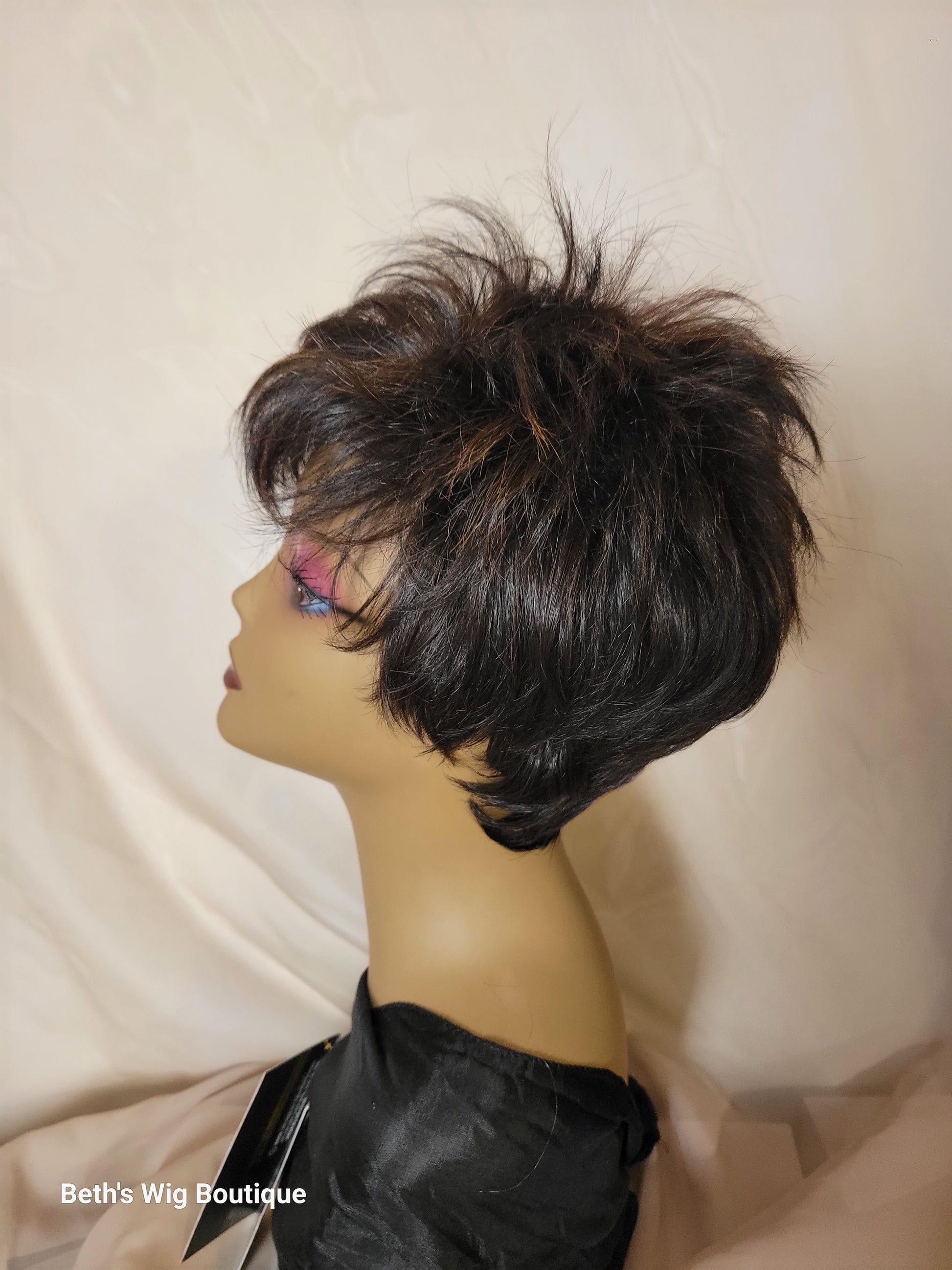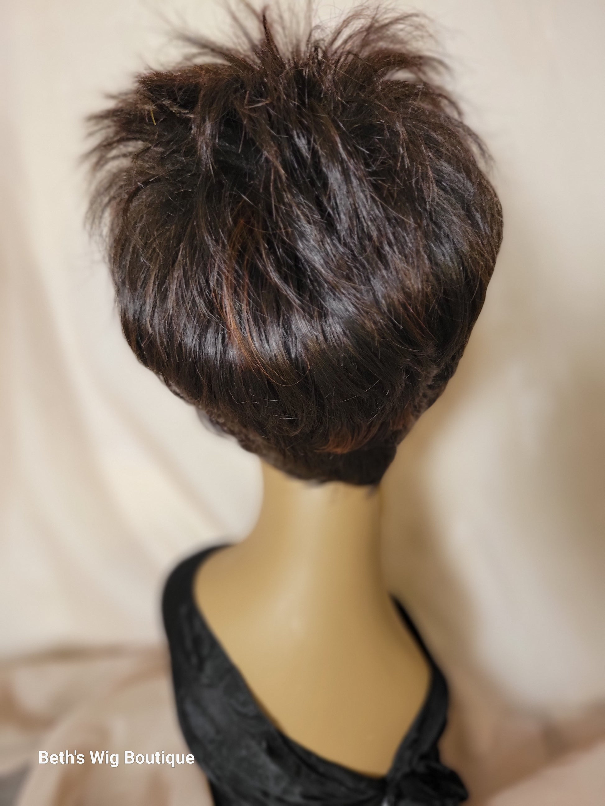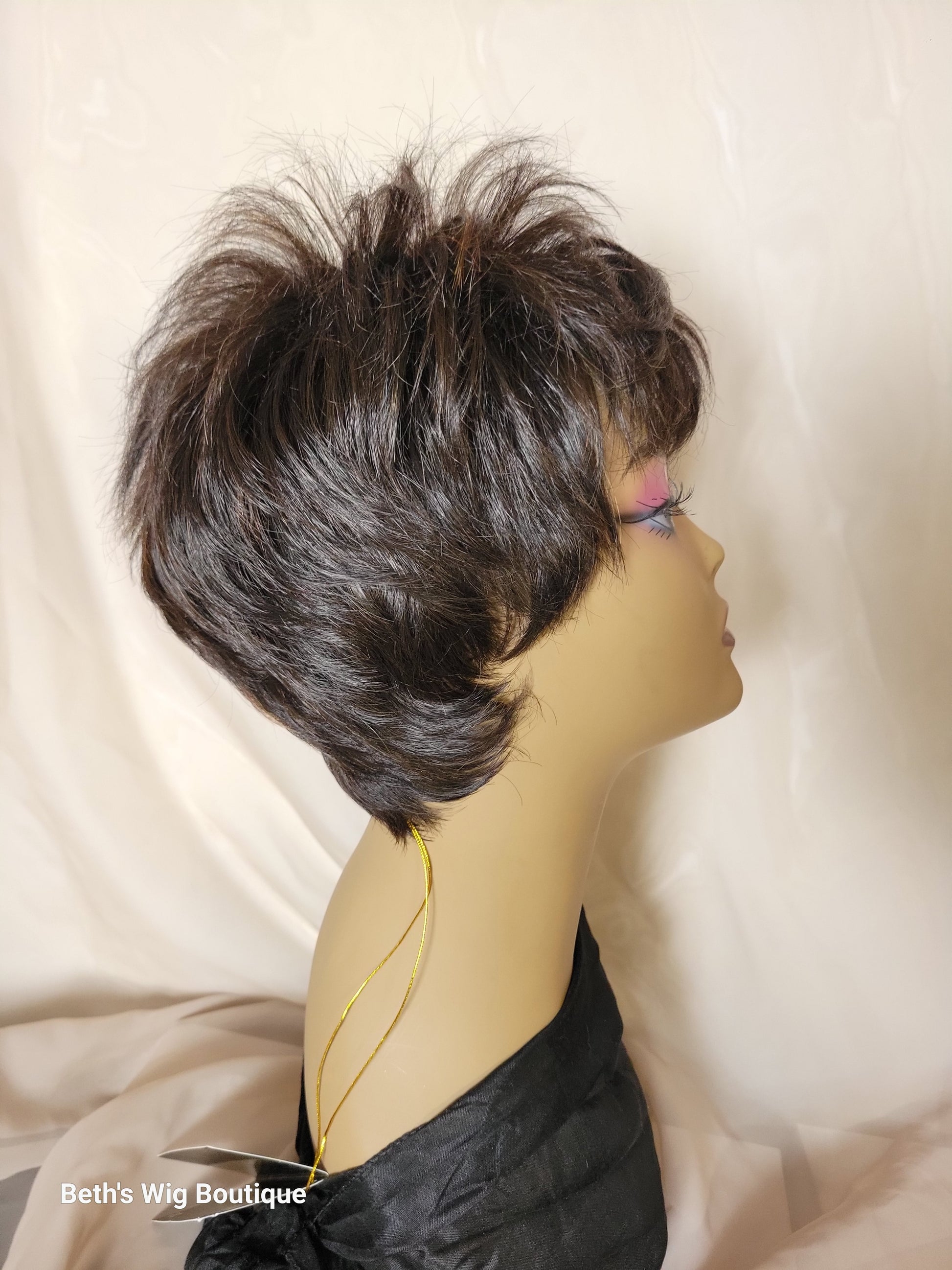 Featuring wispy bangs, textured layers, and a tapered neckline, this wig delivers a natural and modern look. The hand-knotted monofilament part and lace front create the appearance of real hair growth, while the heat-resistant synthetic fiber adds versatility. With soft spikes in the crown for a tailored finish, this wig is a perfect blend of style and functionality.