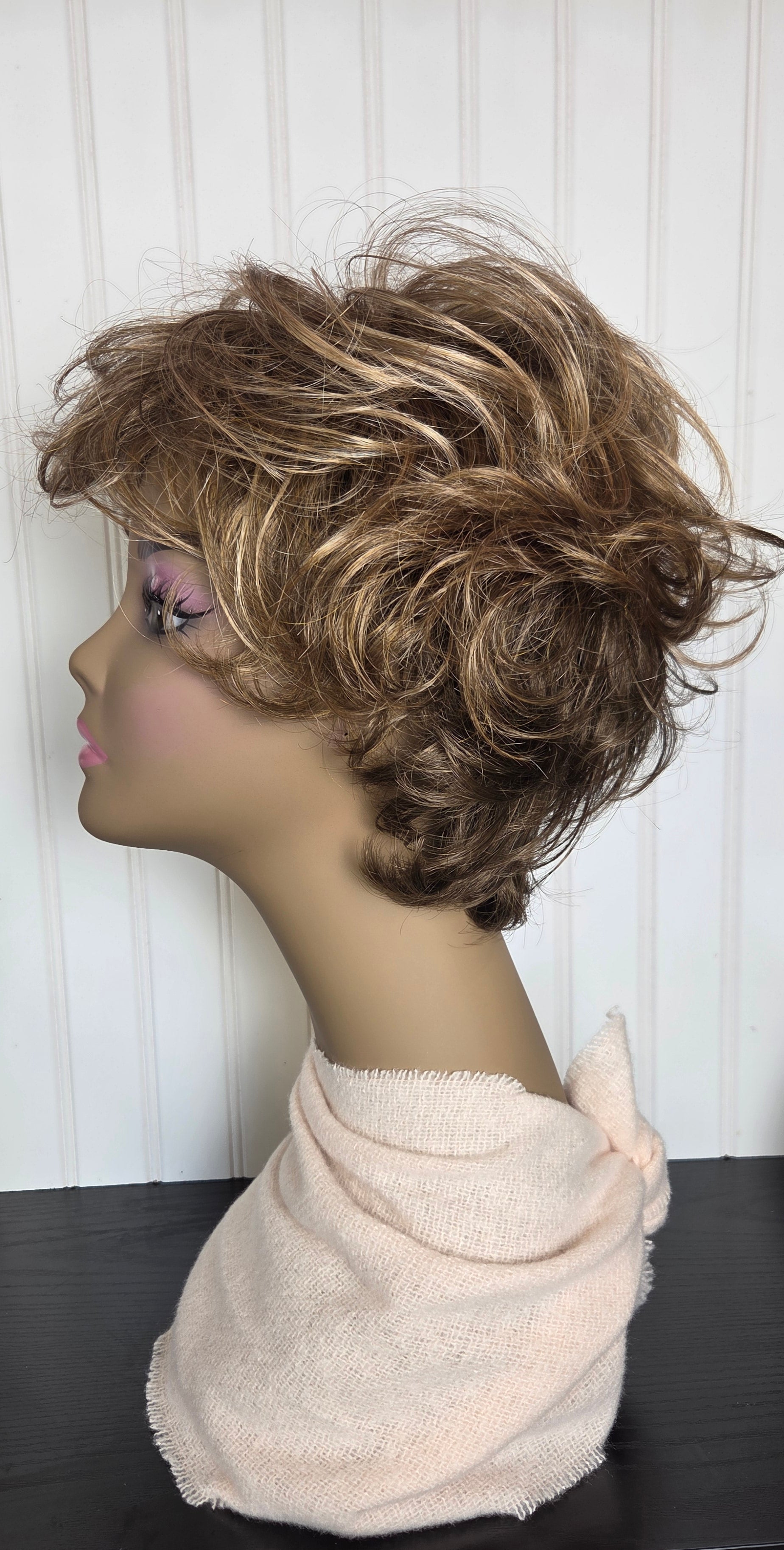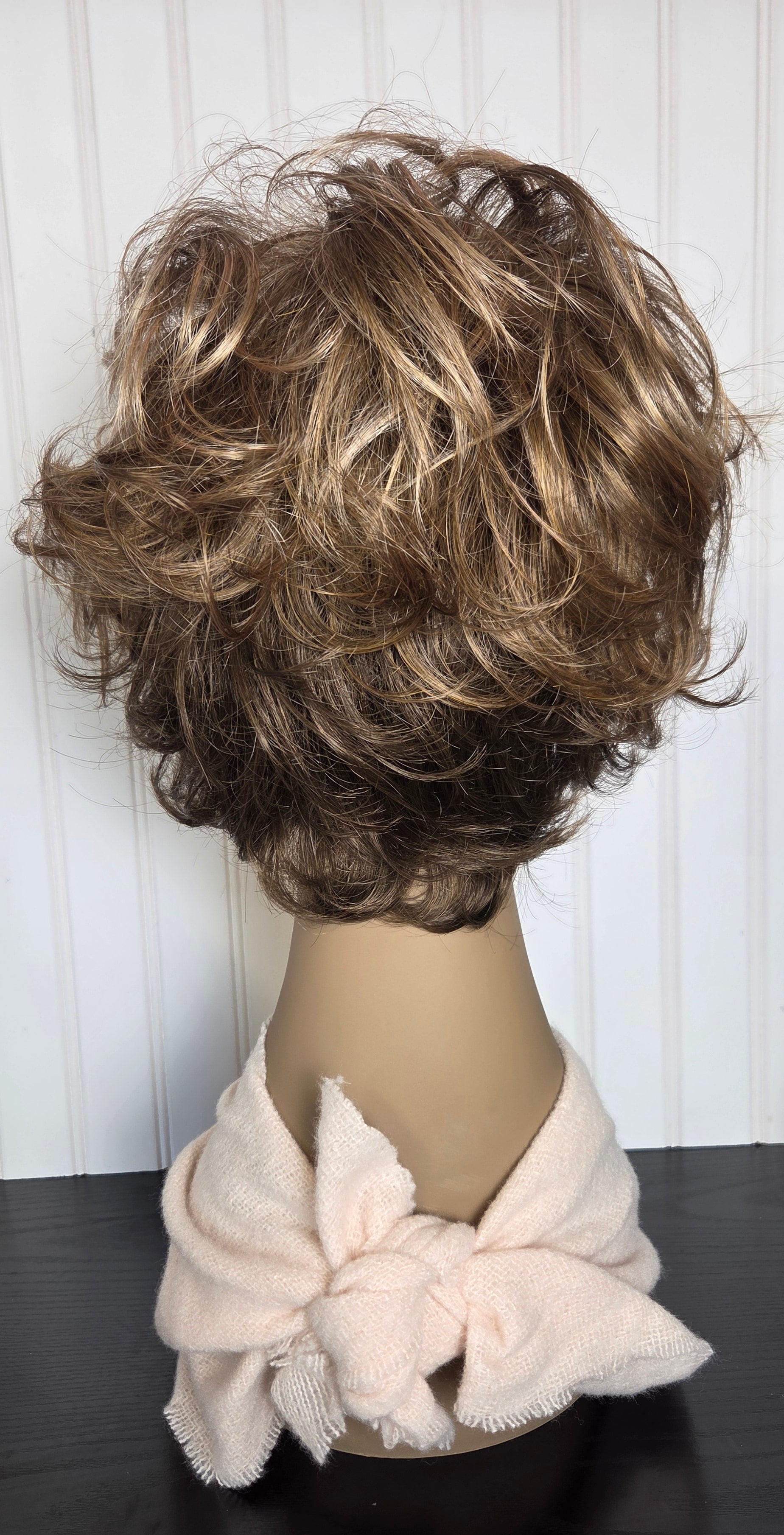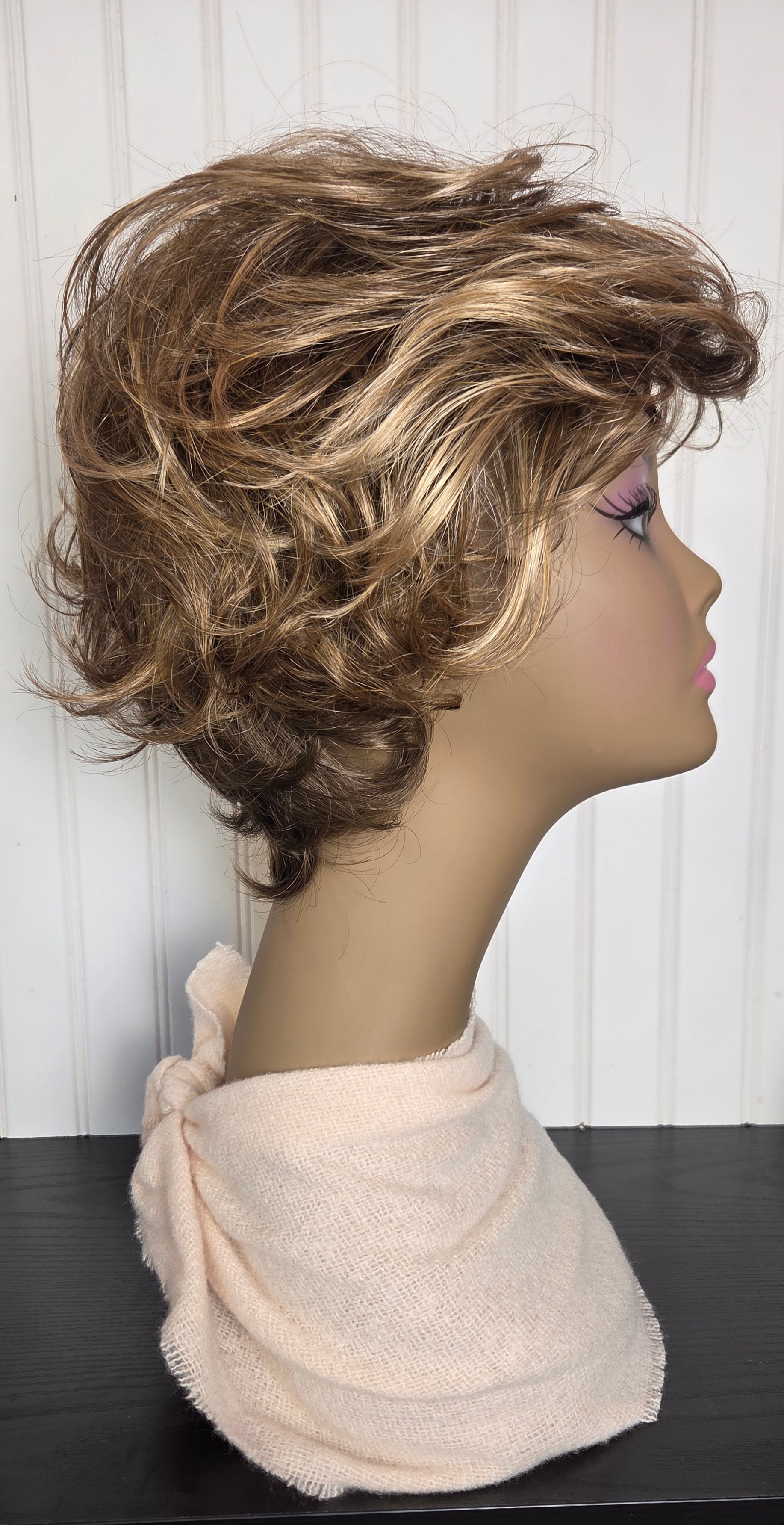 This short, wavy, layered style defines soft sophistication. Graceful sides feather back. WhisperLite® fiber is so lightweight, you won't even know you're wearing a wig! The extended neck allows more coverage of the nape hairline so you can easily tuck away any stray hairs underneath. Easy-care Kanekalon® synthetic fiber keeps the look with minimal upkeep. Open ear tabs make this wig a great wig for eyeglass wearers. Permalift technology provides volume to the style without adding weight. Length: 5" Front, Sides and Upper Back; 6" Top and Crown; 3" Nape. Weight: 2.5 oz.