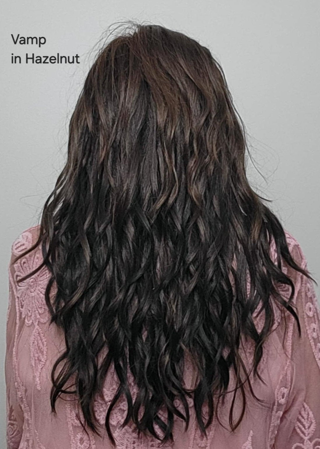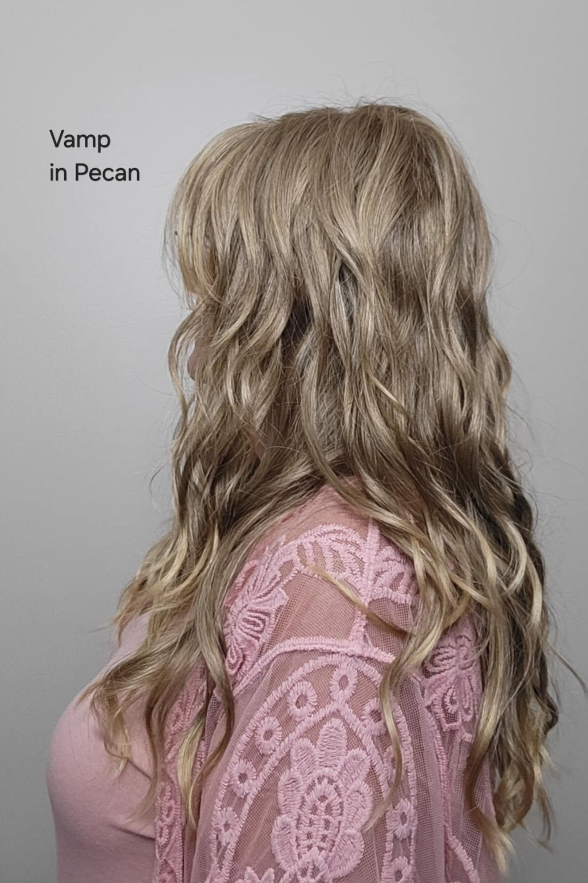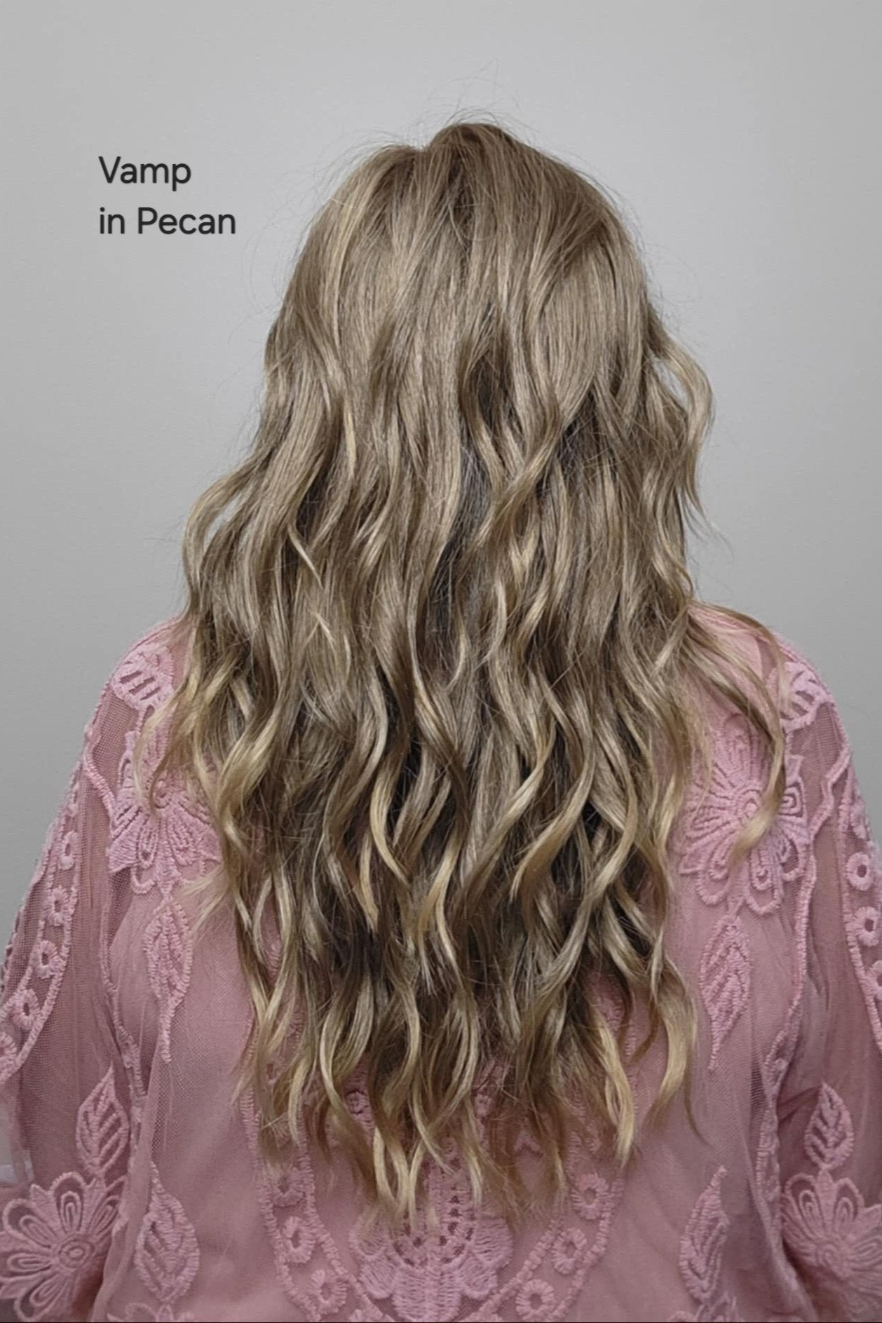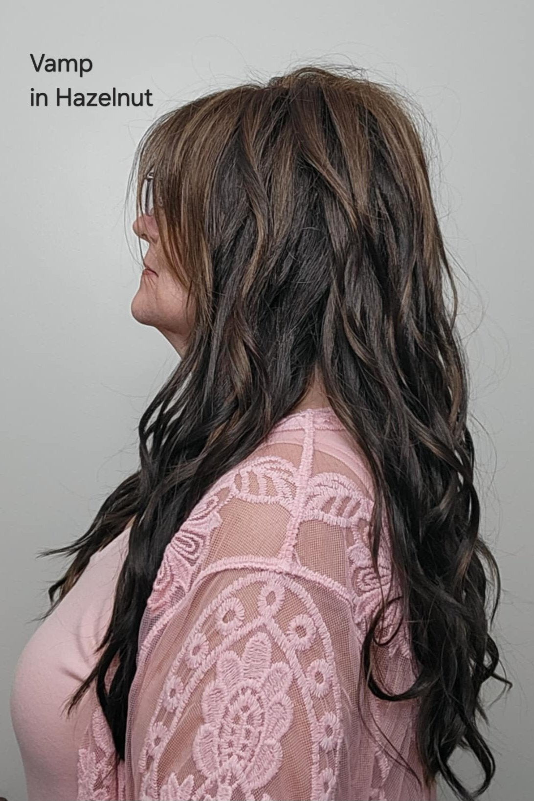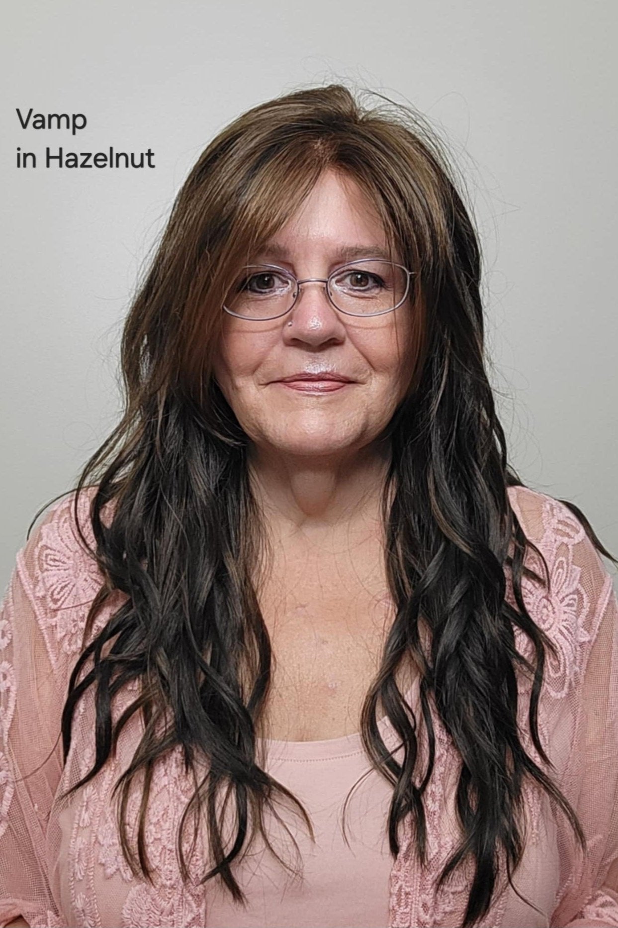 This gorgeous long-layered, wavy style with face-framing long bangs and locks that flow well below the shoulders also features a lace front with a lace part. The styling options are endless!
